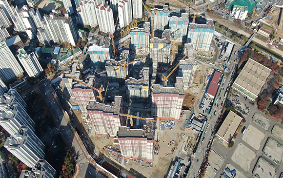-. 내장공사 : 각동 1 ~10F 세대 바닥먹 및 단열재, 합지, 석고 시공
