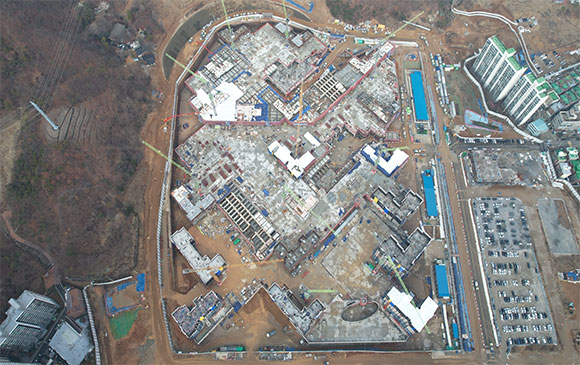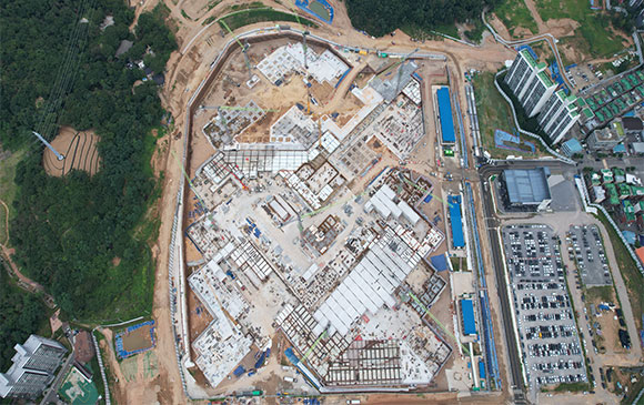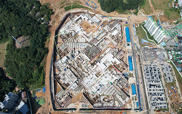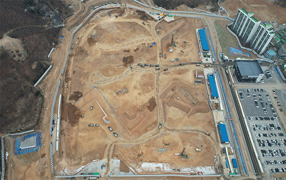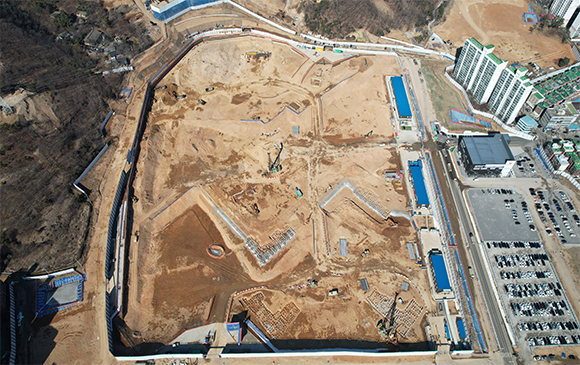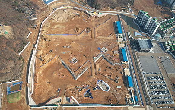 ▶ 외곽부 흙막이 및 발파공사 진행 중 (어스앙카 및 띠장)